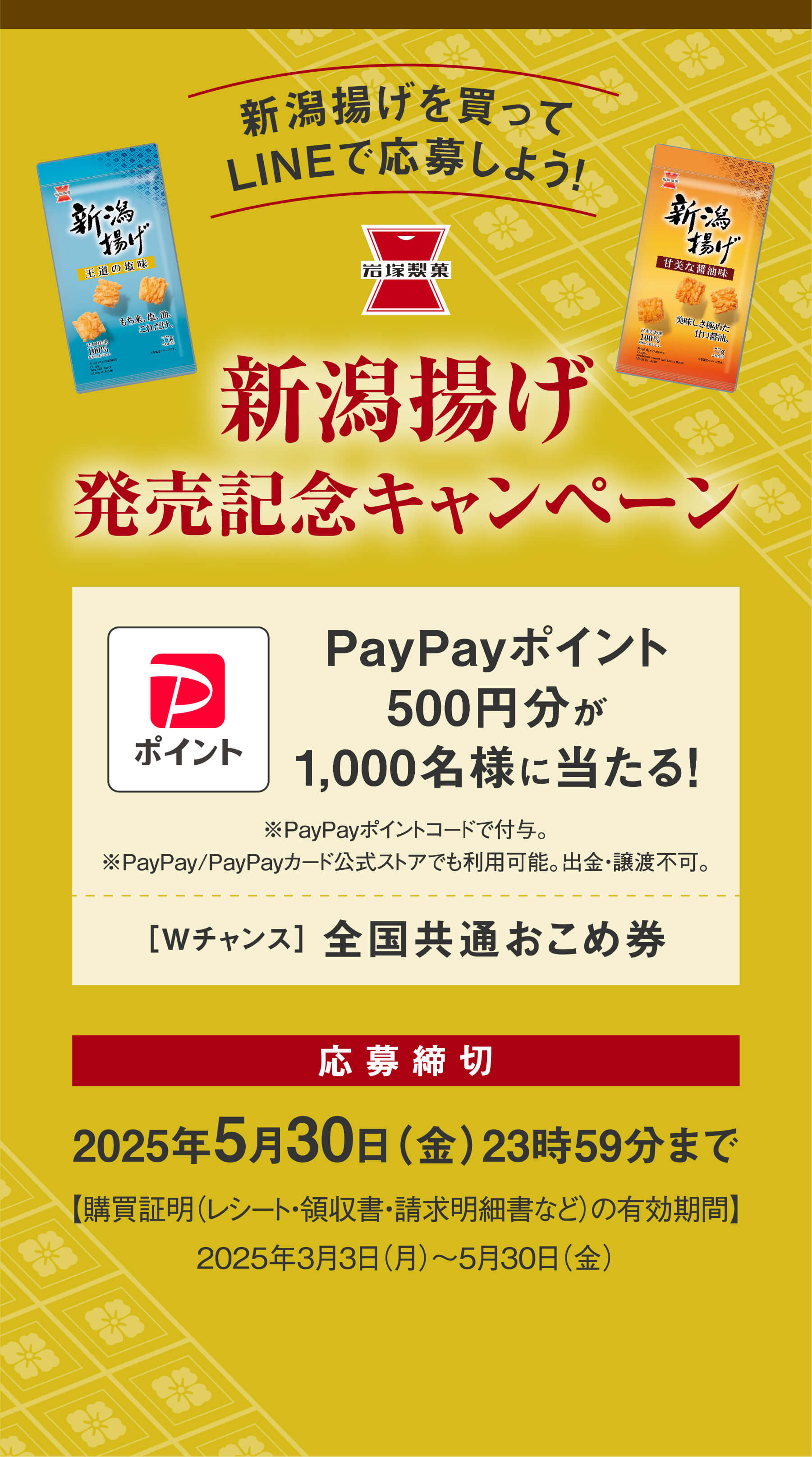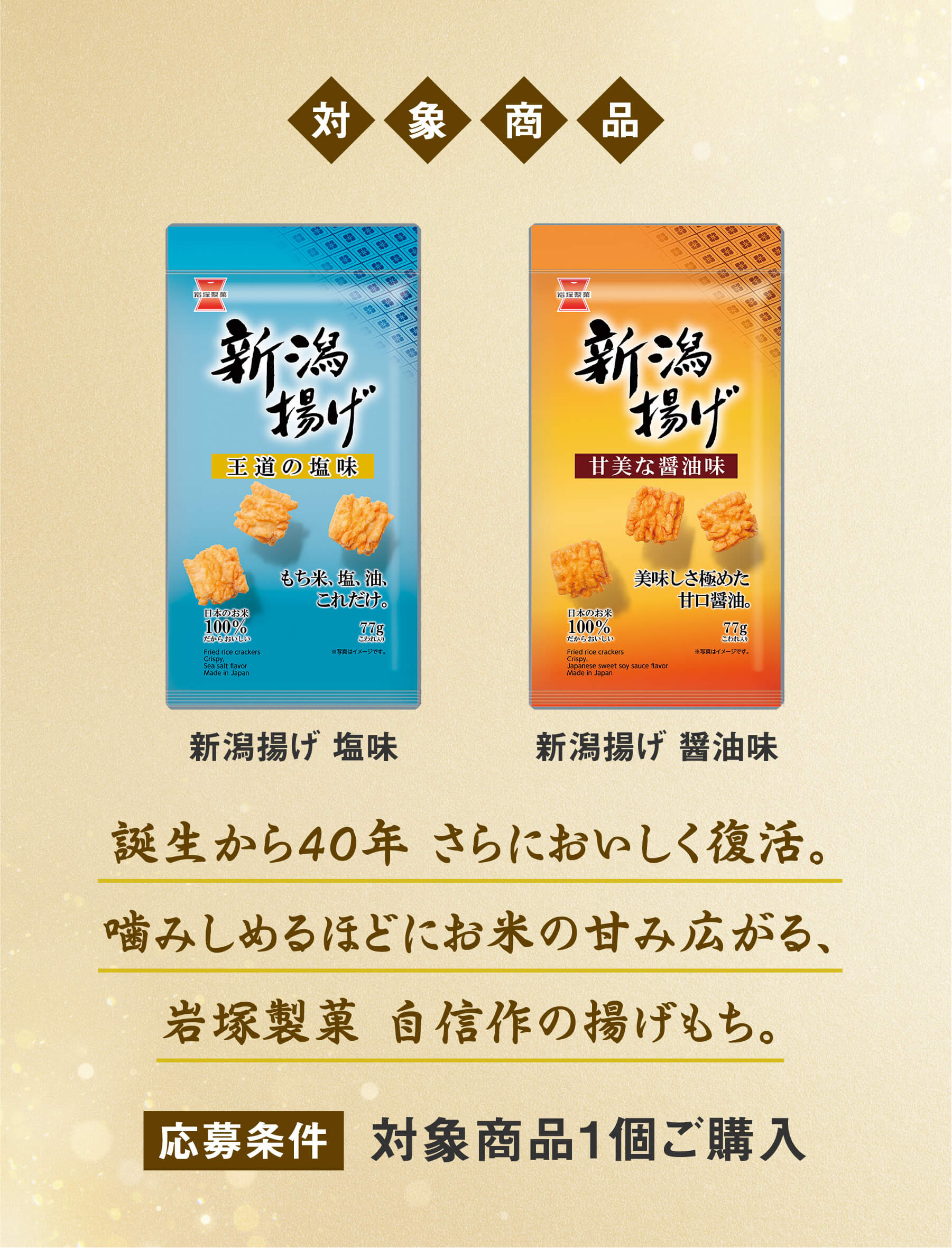 キャンペーン期間中に、岩塚製菓の新潟揚げ 塩味 / 新潟揚げ 醤油味を1個以上ご購入くださった方を対象としたプレゼントキャンペーンです。