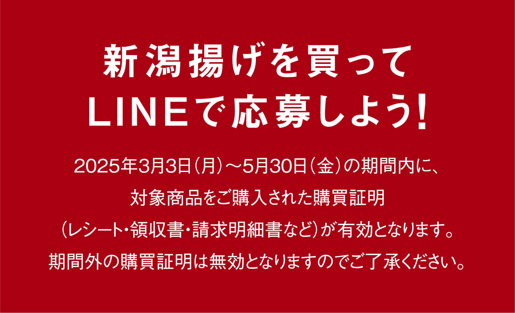 岩塚製菓株式会社(以下、当社といいます)が主催する「新潟揚げ発売記念キャンペーン(以下、「本キャンペーン」といいます)」にご応募される前に本規約をよくお読みになり、ご同意いただける場合に限りご応募ください。ご応募された場合、ご同意いただいたものとみなします。