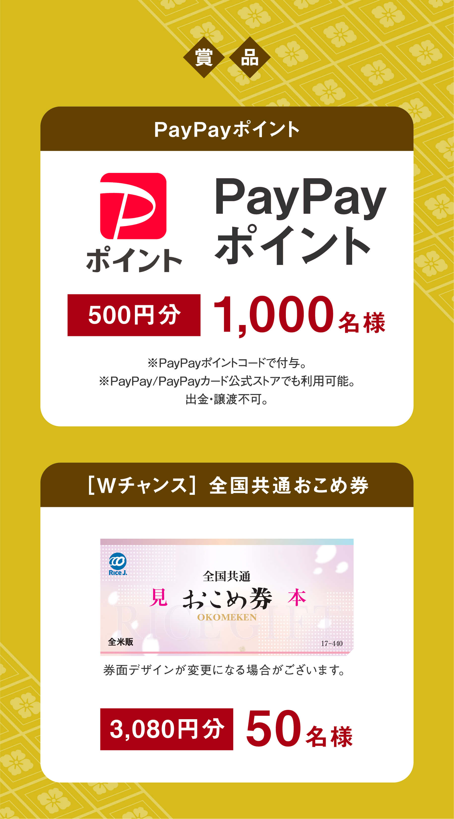 - 全国共通おこめ券3,080円分にご当選された方には、賞品をお届けするための個人情報登録フォームのURLをお送りいたします。トークメッセージに記載の期日までに賞品送付のための情報をご登録いただけない場合、ご当選は無効といたします。