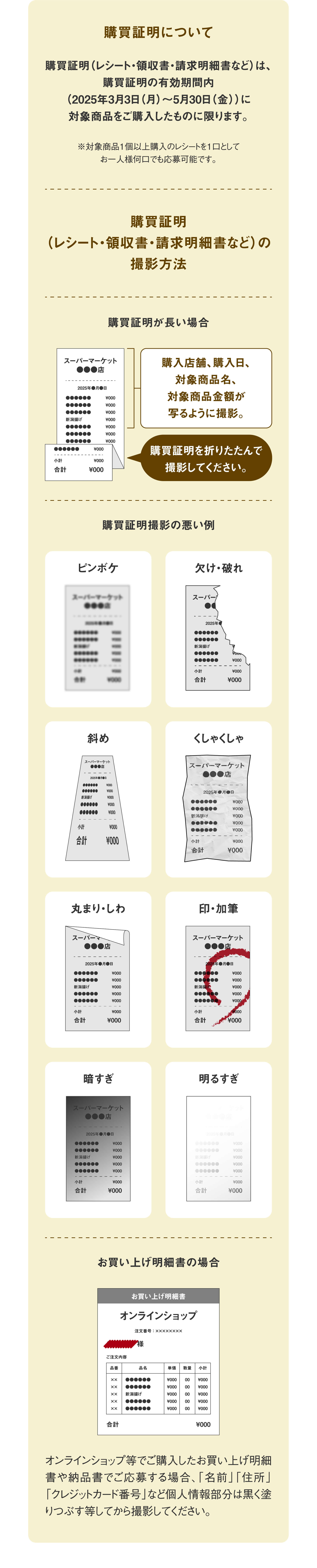 ※ご応募には「購入店舗、購入日、対象商品名、対象商品金額」が確認できる購買証明(レシート・領収書・請求明細書など)が必要です。